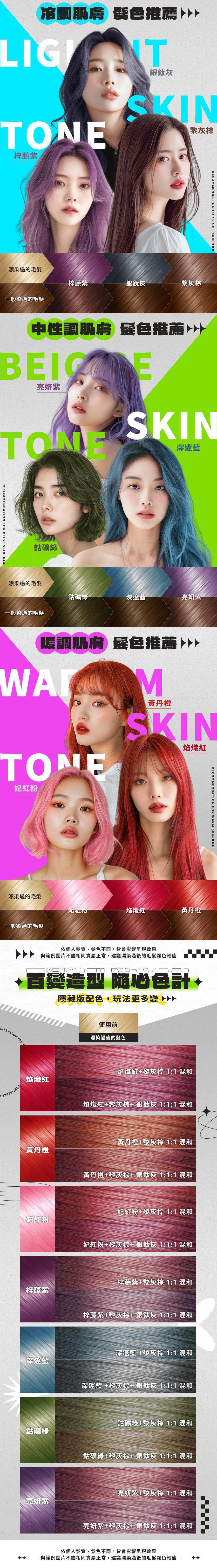 每人髮質/髮色/明亮程度不同,皆會影響染後效果,顯色程度有所差異,與範例圖片不盡相同實屬正常。